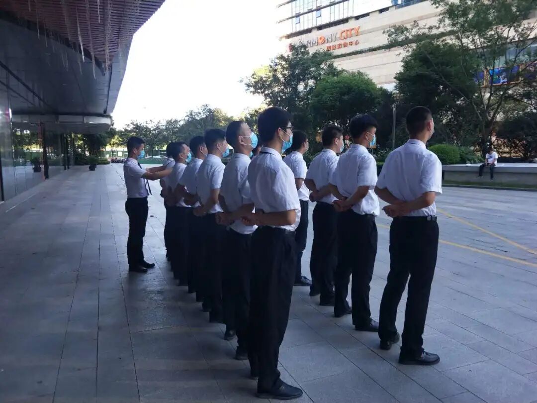 七点钟,到达项目后全员集合,主管组织晨会。晨会的第一项是军事队列训练,是为进一步提升保安队伍形象,努力打造一支素质好、作风硬、纪律明的保安队伍。从站姿、转体等基本动作进行重复练习,力求做到熟能生巧,在一遍遍看似枯燥的训练中,你能看到队员的细小变化,有一种气势油然而生,他们的目光慢慢变得坚定自信,从最初的步履不稳、协调性差、队型不整,到后来的步伐稳健、协调一致、整体划一,队员们的精、气、神得到了全面提升。让人感觉到他们强健的脊梁,似乎已经可以扛起更大的风雨。